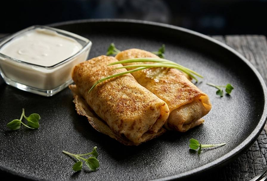 Яичница из двух яиц с охотничьими колбасками, свежие овощи с соусом песто.