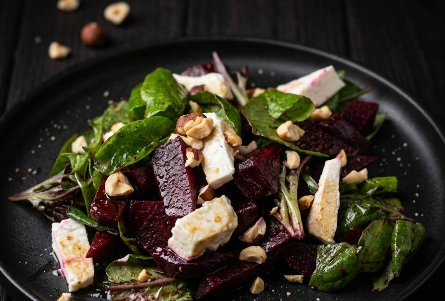 Микс салата, запеченная свекла, сыр брынза, орешки, заправка.
