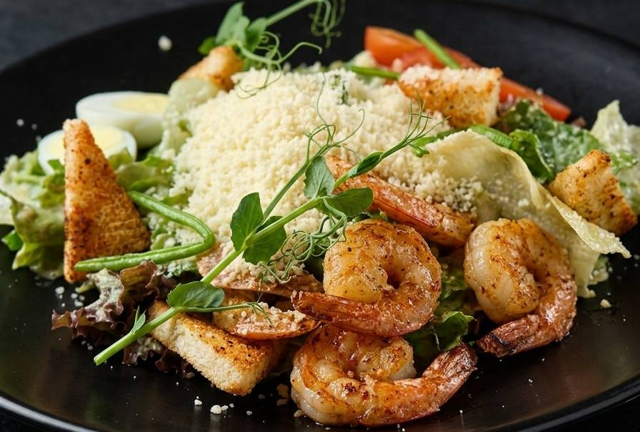 Микс салата, креветки королевские, помидоры черри, яйцо перепелиное, сыр пармезан, сухарики, соус.