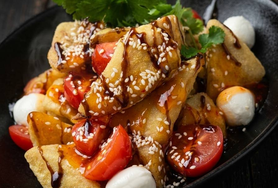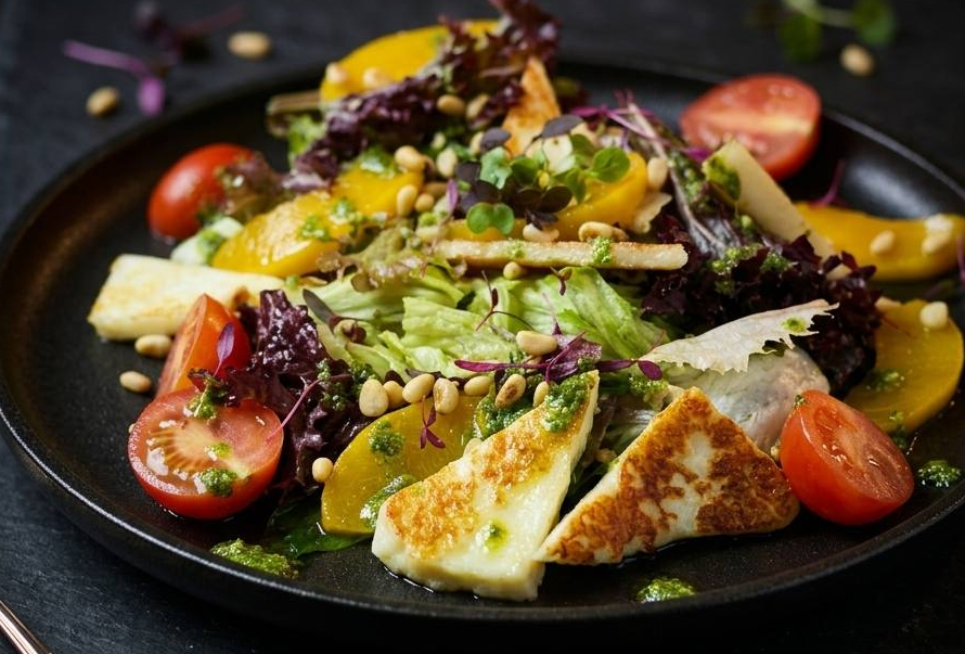 Микс салата, сыр халуми, помидоры черри, авокадо, персик, заправка.