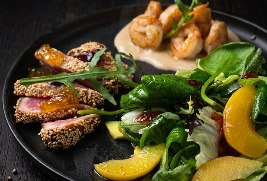 Микс салата, креветки королевские, тунец, авокадо, персик, соус.