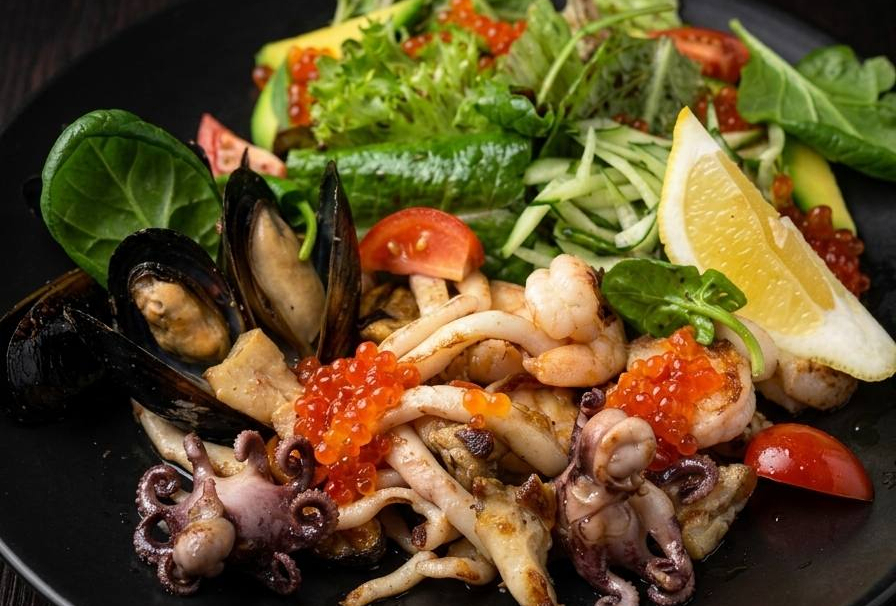 Микс салата, мясо мидий, мидии в створках, рапаны, креветки королевские, осьминог беби, кальмар, огурец, помидоры черри, авокадо, заправка.