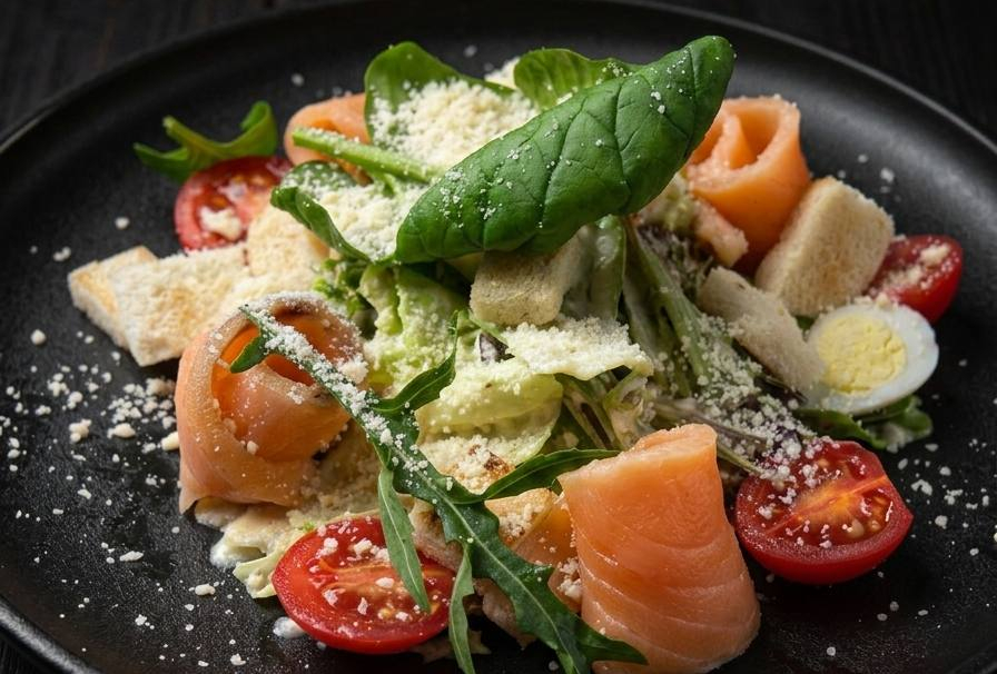 Микс салата, лосось слабосоленый, помидоры черри, яйцо перепелиное, сыр пармезан, сухарики, соус.
