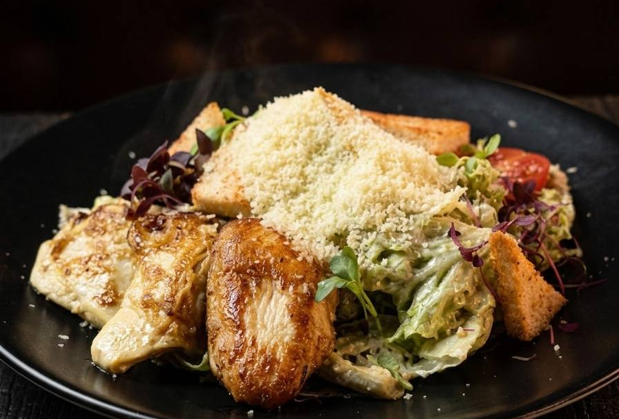 Микс салата, куриное филе, помидоры черри, яйцо перепелиное, сыр пармезан, сухарики, соус.