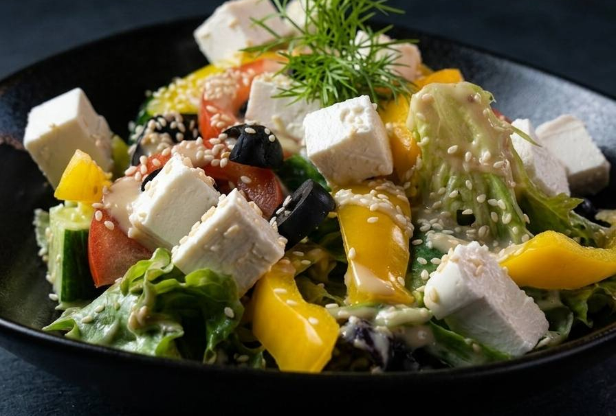 Микс салата, огурец, помидор, перец болгарский, маслины, сыр брынза, заправка.