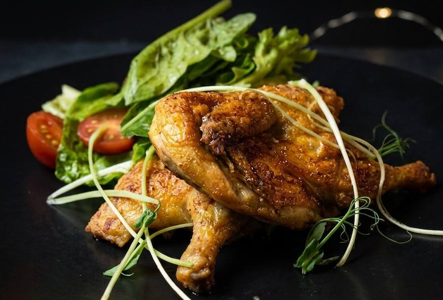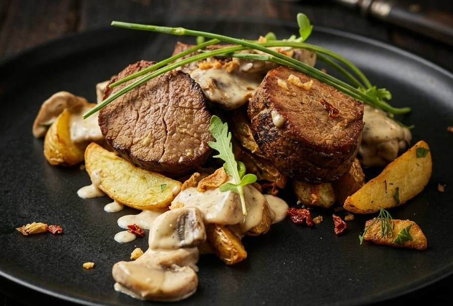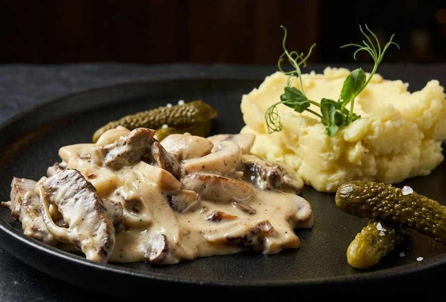 Подаются с хрустящим картофелем и сливочно-грибным соусом.