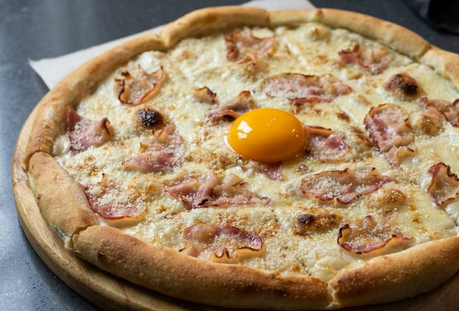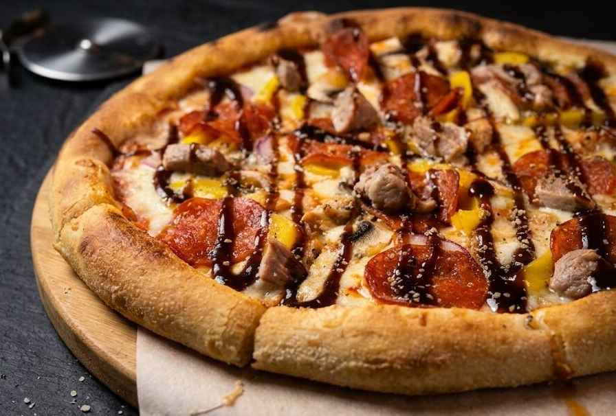 Куриное филе, бекон, лук, сыр моцарелла, соус барбекю, соус томатный.