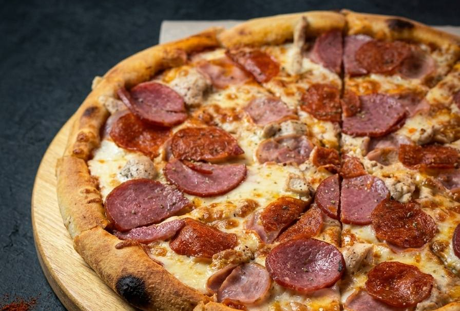Филе куриное, ветчина, пикантная пепперони, салями, сыр моцарелла, соус томатный.