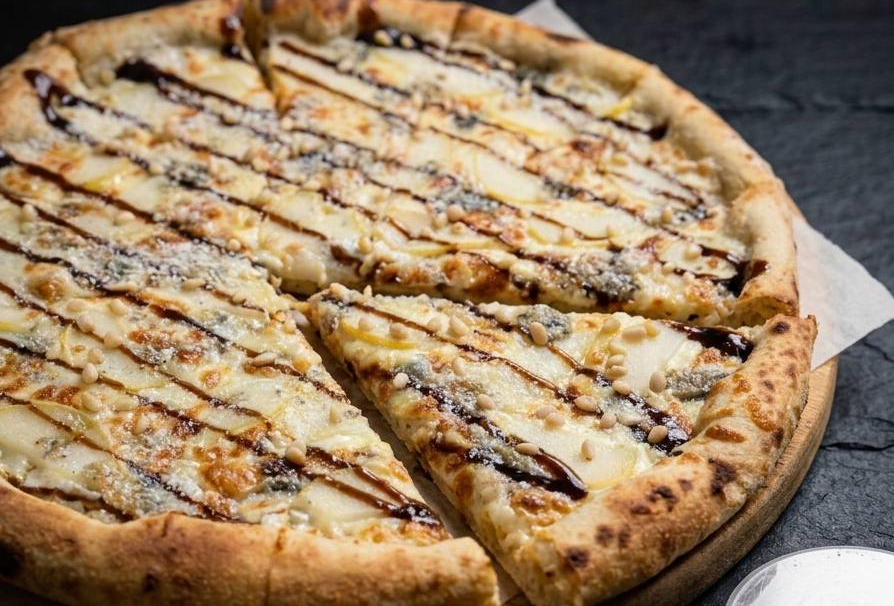 Груша, сыр дор блю, сыр моцарелла, орешки кедровые, соус сливочный, соус бальзамический.