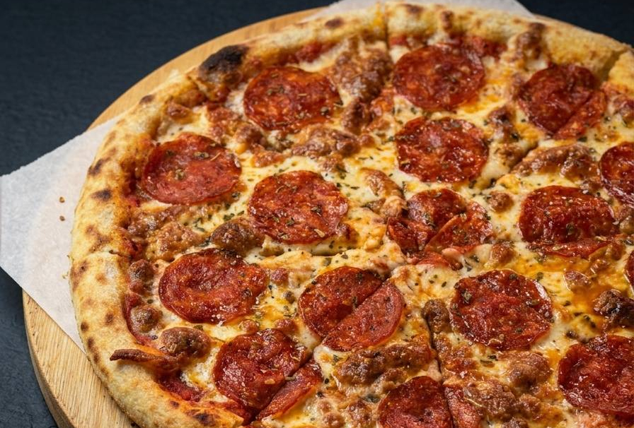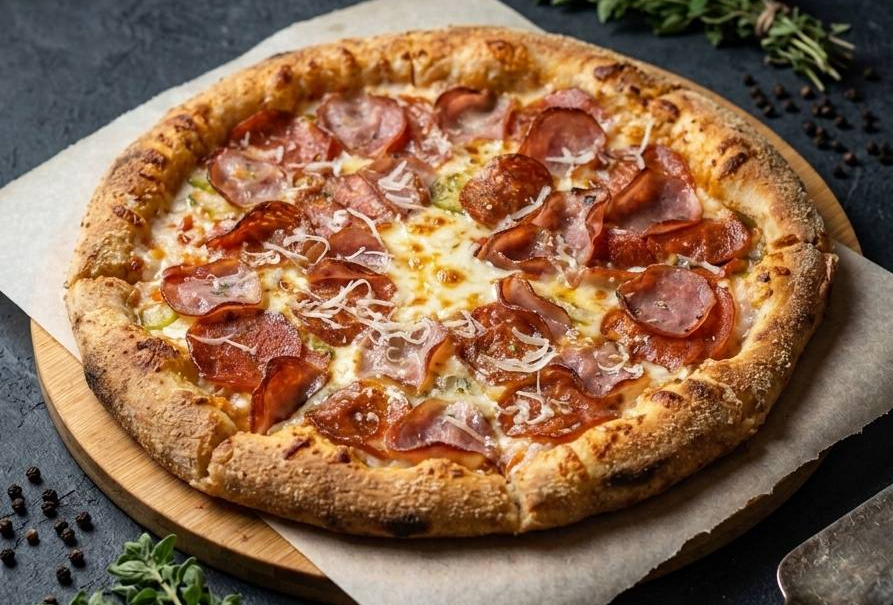Пикантная пепперони, ветчина, соленые огурчики, томаты, сыр моцарелла, соус томатный.